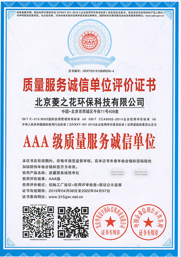 質量服務誠信單位評價證書